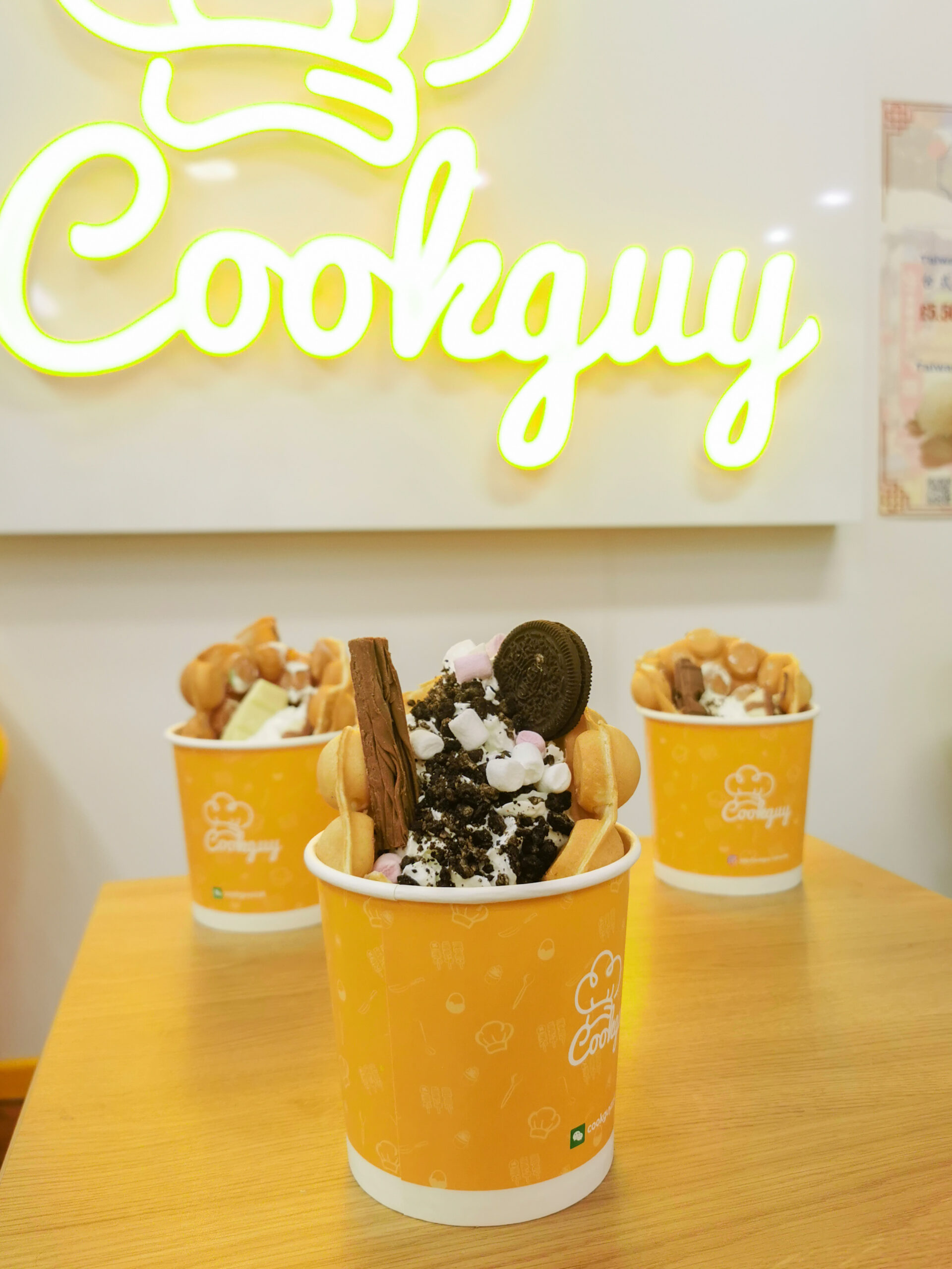 If you’re feeling hungry, order our customisable sticky rice roll or Taiwan Style Braised Pork rice. If you’re looking for a light snack, our egg and sausage sandwich and chicken legs are excellent. Complete your visit with a Cookguy™️ Bubble Waffle.