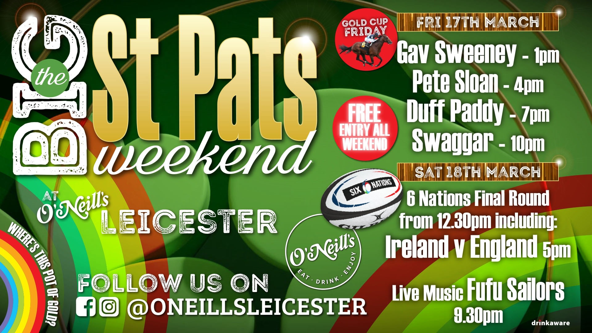 This year it’s not just about St. Paddy’s on 17th March, O’Neill’s will be partying all week from 13th-19th, with Irish craic, exclusive drinks offers, a massive weekend of sport and great entertainment in Leicester.