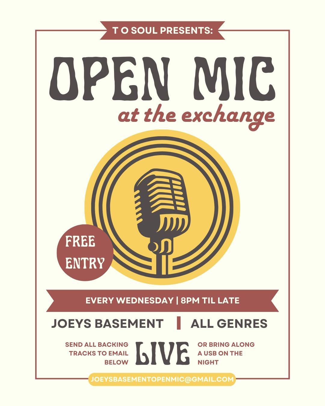 Open Mic – The Exchange Bar’s regular open mic event is hosted by Joey from T O Soul and takes place every Wednesday night. All welcome from rappers to saxophonists.