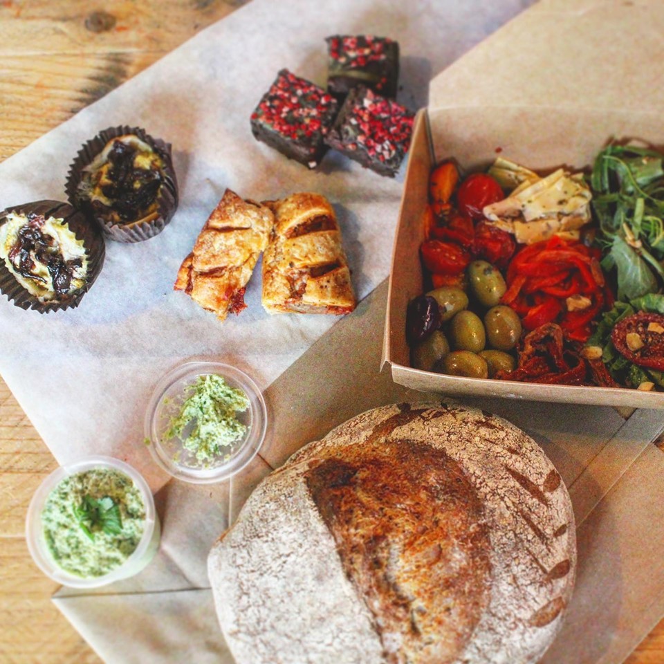 Vegan Picnic Boxes with a choice of Sourdough or Focaccia. Enjoy Apple & Cumberland Spice Sausage Rolls, Asparagus & Feta Quiches, Mixed Antipasti and more.