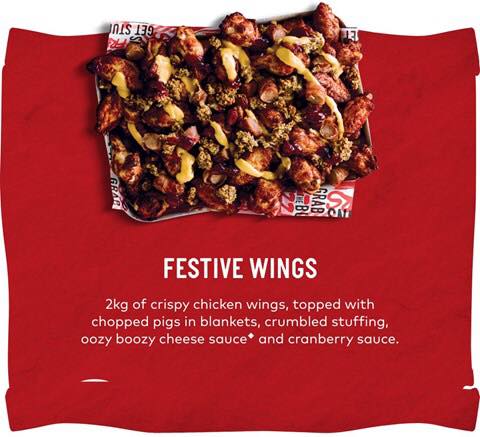 They have also introduced the limited edition festive wings challenge – two kilograms of crispy chicken wings, topped with chopped pigs in blankets, crumbled stuffing, oozy boozy cheese sauce and cranberry sauce. Although you can obviously share rather than try and scoff the lot by yourself.