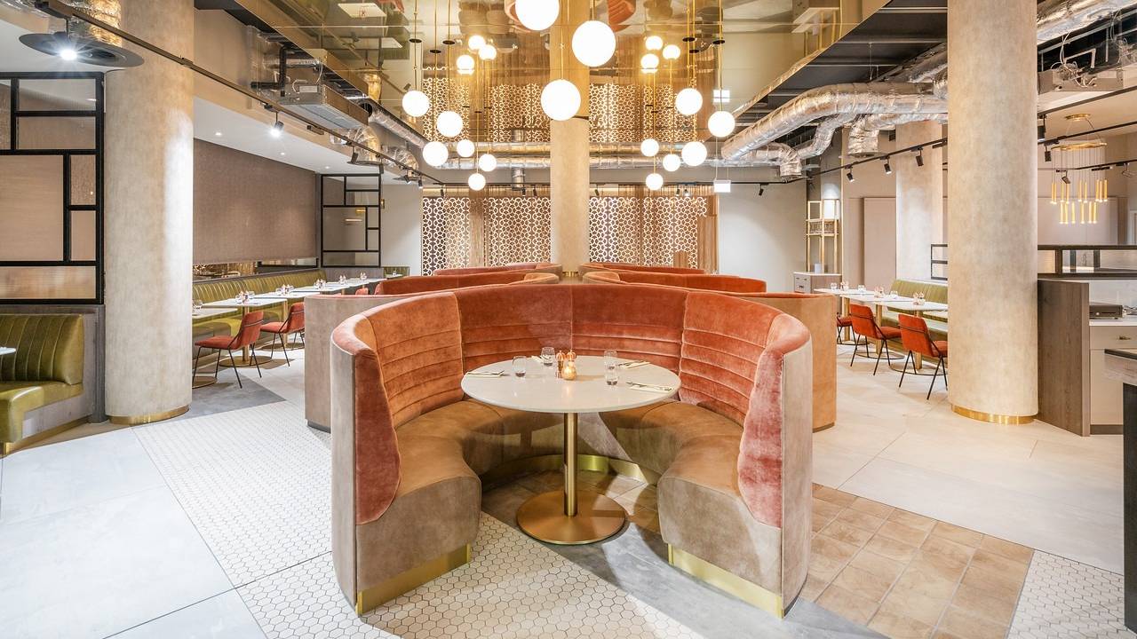 The interior, which takes inspiration from the mosaic which was excavated from a high-status Roman villa found directly underneath its floors, allows diners to enjoy a special occasion meal or simply grab a stool for cocktails at the bar.