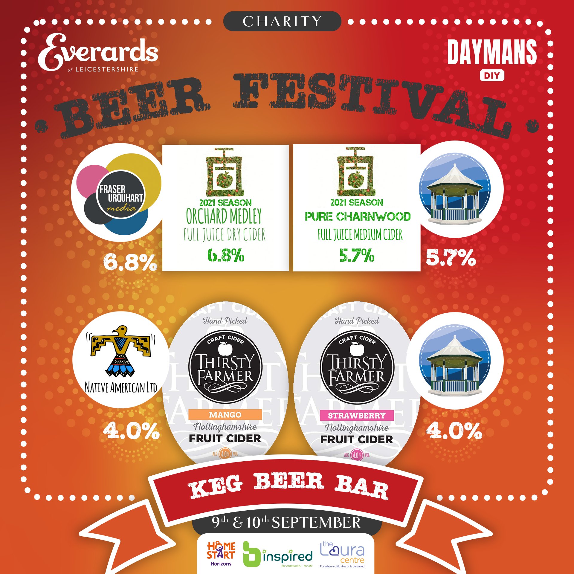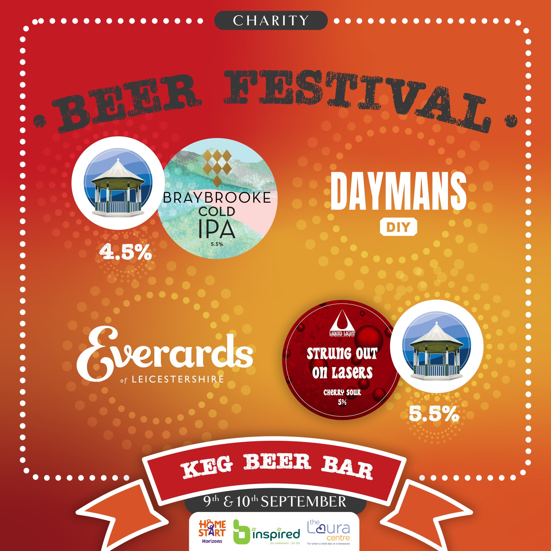This year the Festival will be raising money for 3 local charities, B-Inspired, Home Start and The Laura Centre. Priced at £5 entry (including a free glass) with the following opening times: