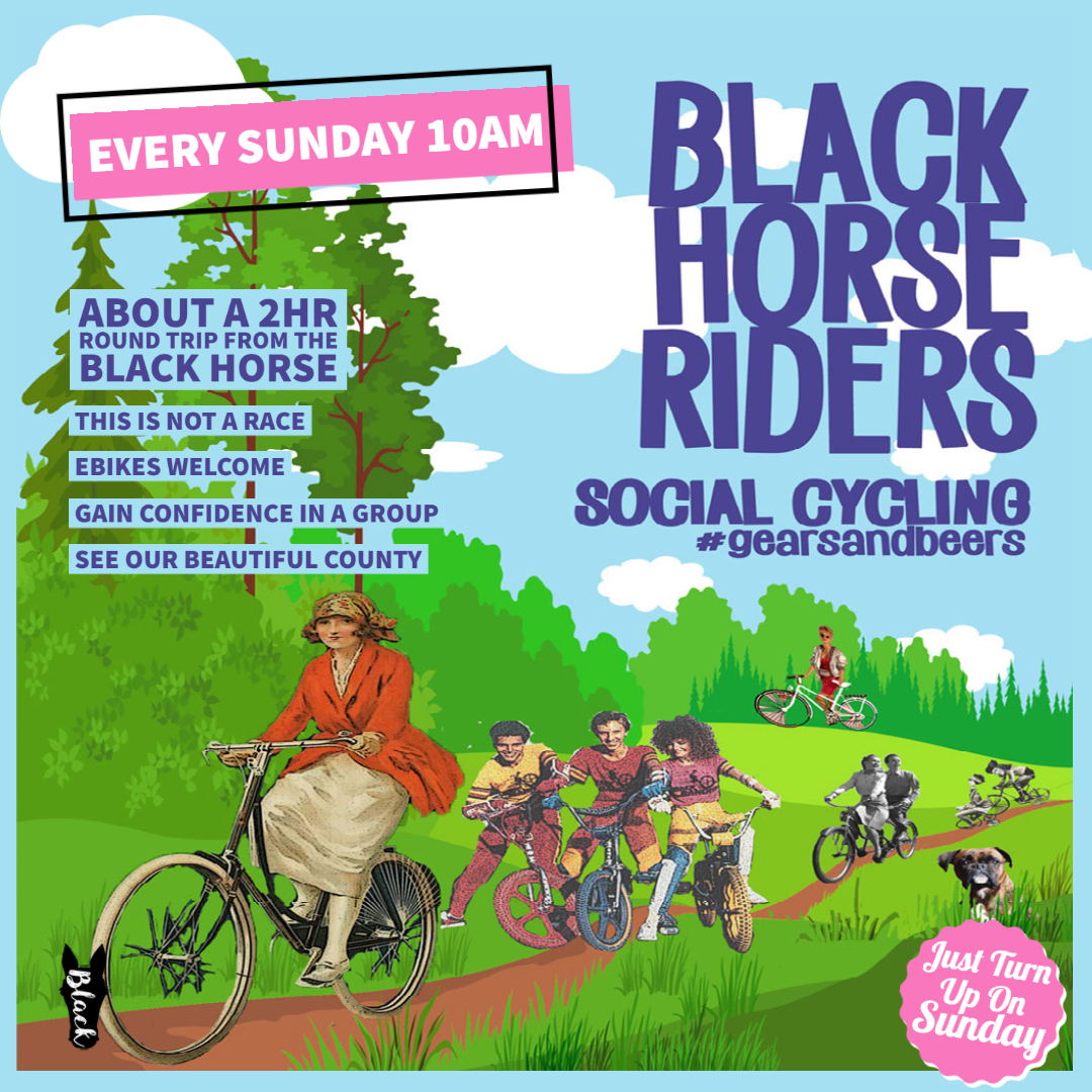 Meeting at 10am every Sunday the bike ride is suitable for all abilities and gives cyclists the opportunity to gain confidence when riding with a group. The 2 hour round trip starts at The Black Horse before taking in some of the lovely surrounding countryside and returning back to pub for drinks afterwards.
