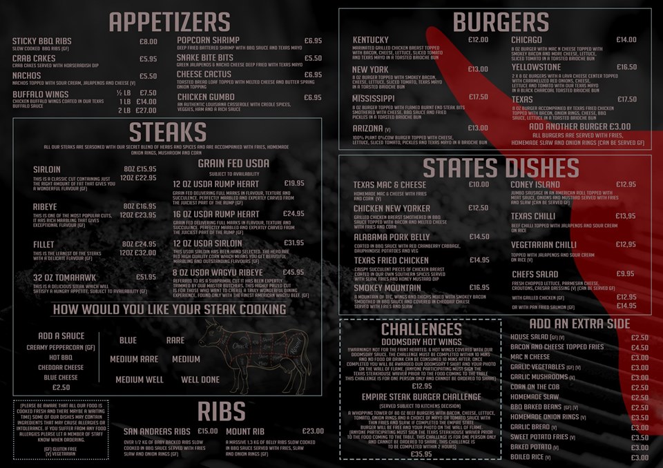 You can see the menu in full below with mains including a range of steaks and burgers as well as their special Mac & Cheese, Alabama Pork Belly, ribs and, of course, their mega food challenges.